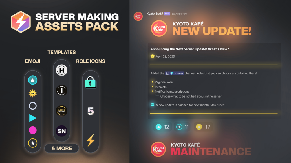 With Server Making Assets Pack, you can save years learning how to create a beautiful server logo, make eye-catching headers, and especially designing role icons! Even advanced server makers often struggle with these.